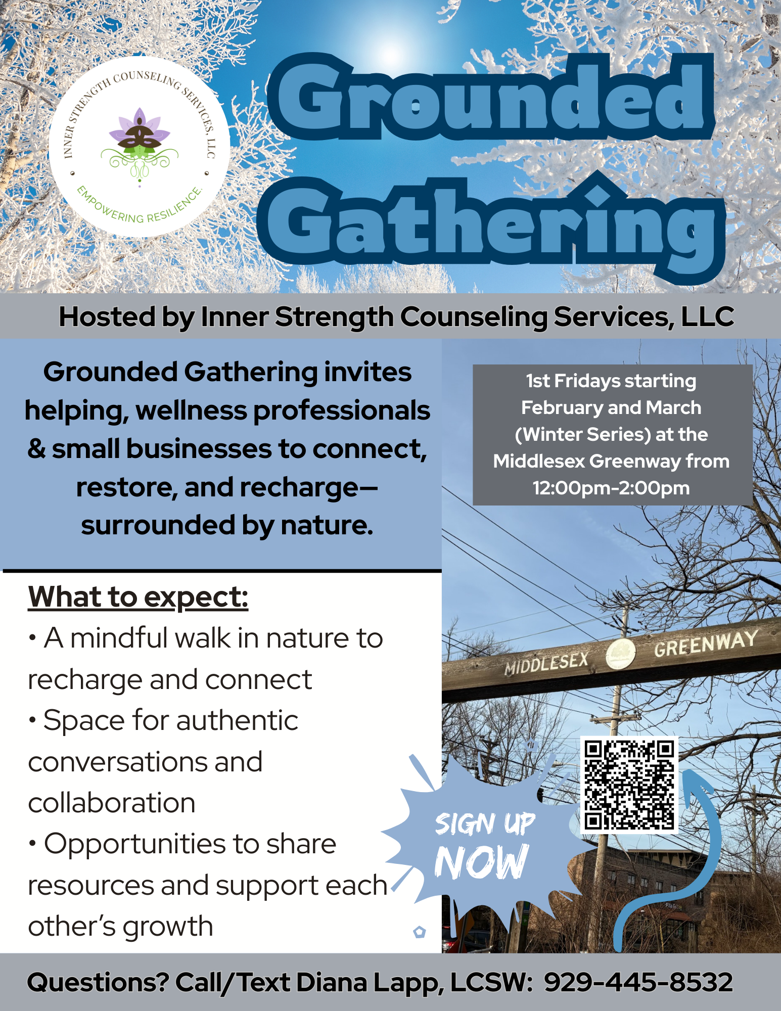 Join us on the Middlesex Greenway for Grounded Gathering: Winter Series — a nature-based networking experience created for helping and wellness professionals who value authentic connection, collaboration, and community.