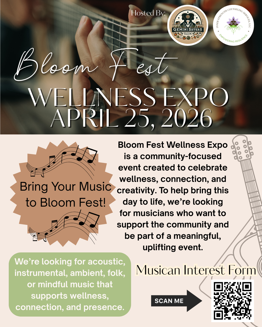 Bloom Fest Wellness Expo is a community-focused event created to celebrate wellness, connection, and creativity. To help bring this special day to life, we’re inviting musicians who feel called to support the community and contribute to a meaningful, uplifting atmosphere.